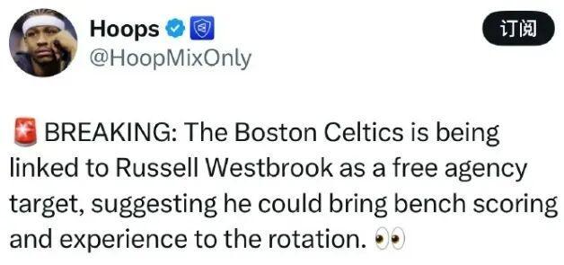 近日美媒Hoops爆料凯尔特人有意在自由市场签下威少,希望为球队的替补阵容补充得分火力和经验。
