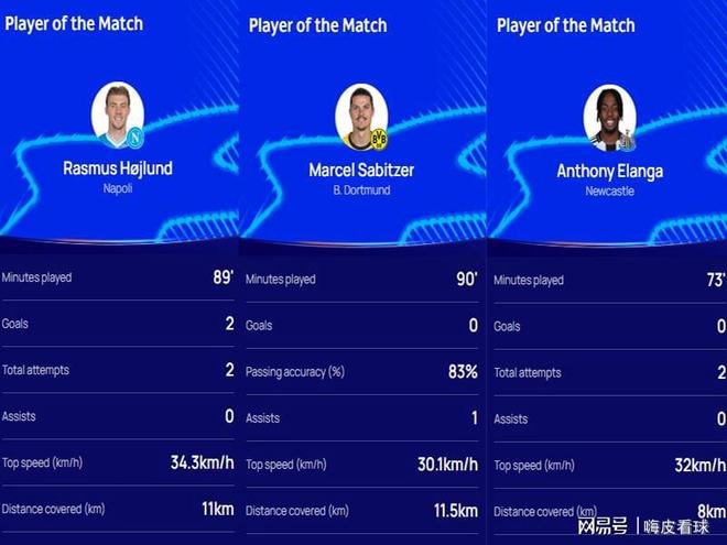 先看看全场最佳,根据欧足联官网发布的信息,来自那不勒斯的霍伊伦,多特蒙德的萨比策,还有纽卡斯尔的埃兰加,三名曼联旧将,赛后都被评选为全场最佳。同时,三支球队均迎来欧冠的首场胜利,首轮补时连丢两球,失去2分的多特蒙德,已经上升到积分榜的前八名。